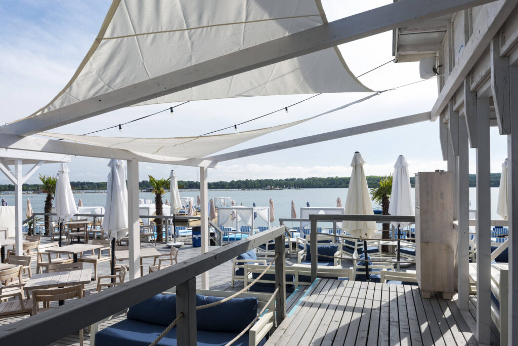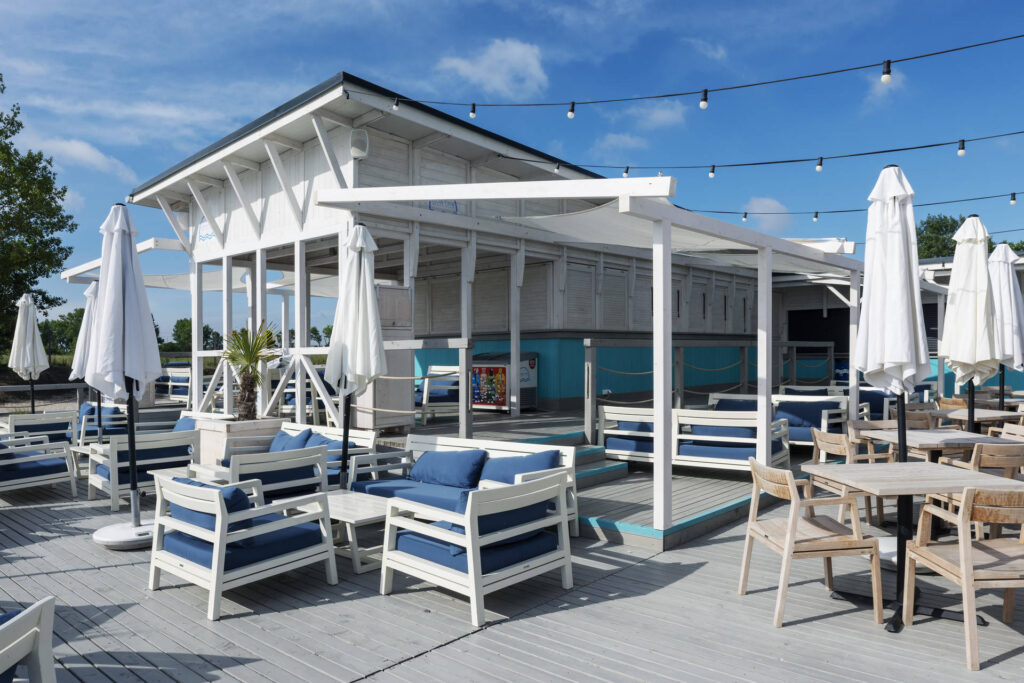The Beach Bar’s white structure with thin pillars and huge windows creates an elegant plage atmosphere and humbly fits to the areas close to the water.