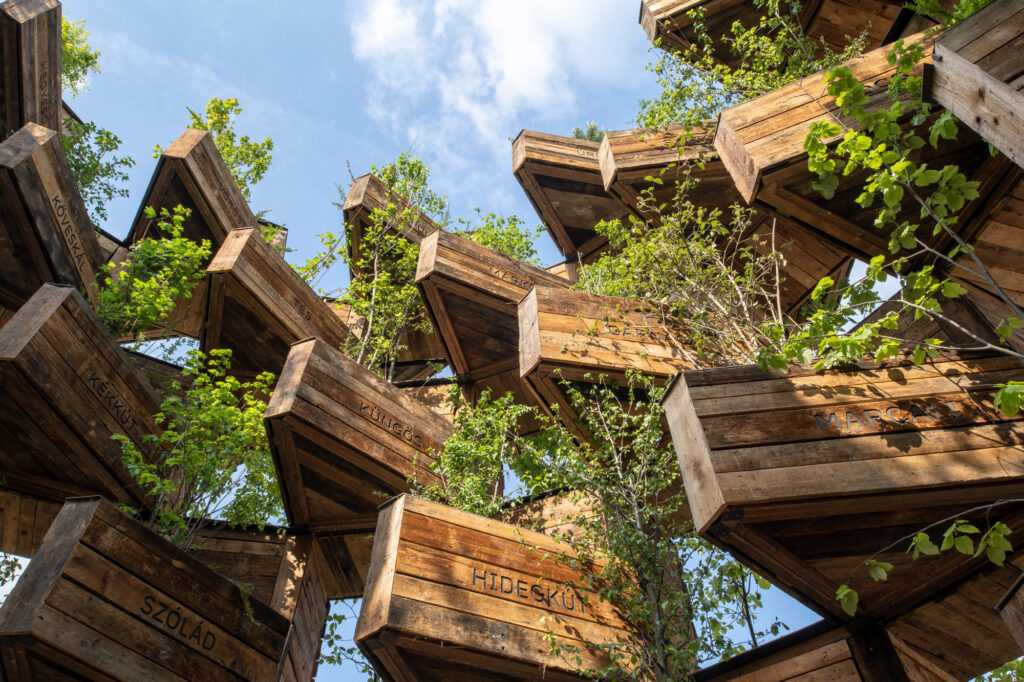 The Garden of Communities is an artwork that celebrates the rich culture of the Veszprém-Balaton region. The pavilion is a symbolic monument to the cooperation of the 116 municipalities participating in the Veszprém-Balaton 2023 European Capital of Culture program.