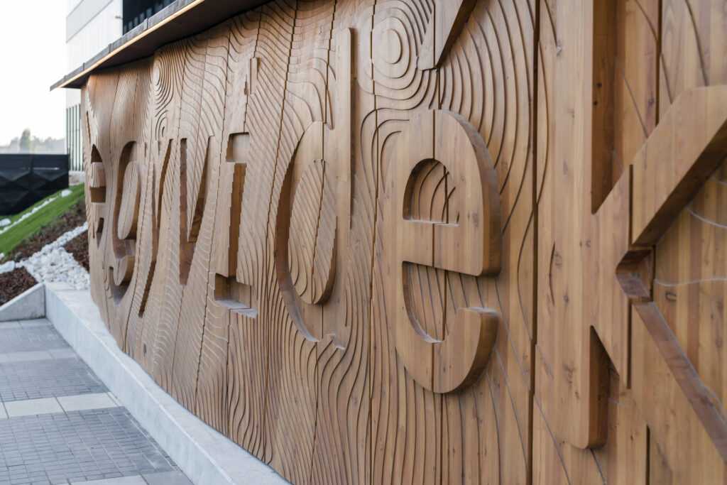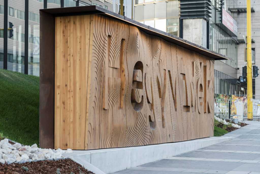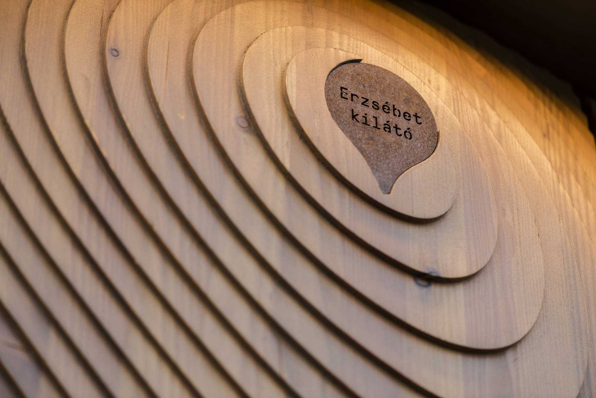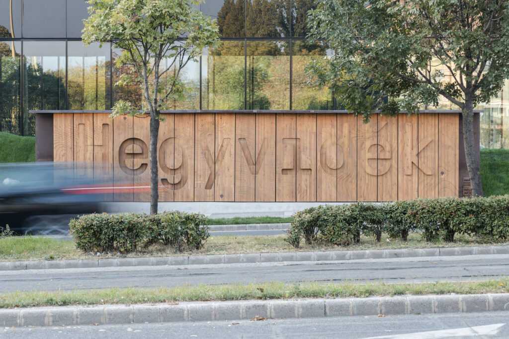The Hegyvidék Sign was installed in front of the Hill Side Business Centre in Budapest in 2018. The dynamic structure describes the topography of the 12th district highlighting two main characteristic and popular locations – the Elisabeth lookout and Normafa – furthermore reflects on the Hill Side Centre. The installation stands on a concrete pedestal, the used material is Siberian larch and CNC-milling technology was applied.