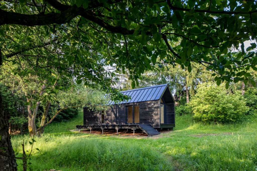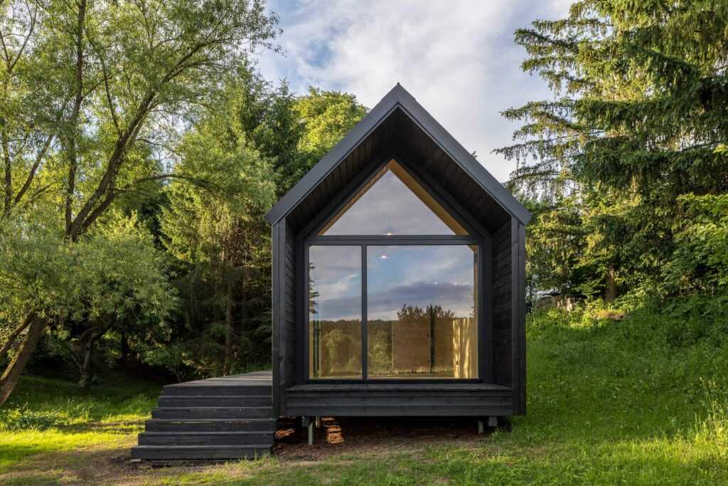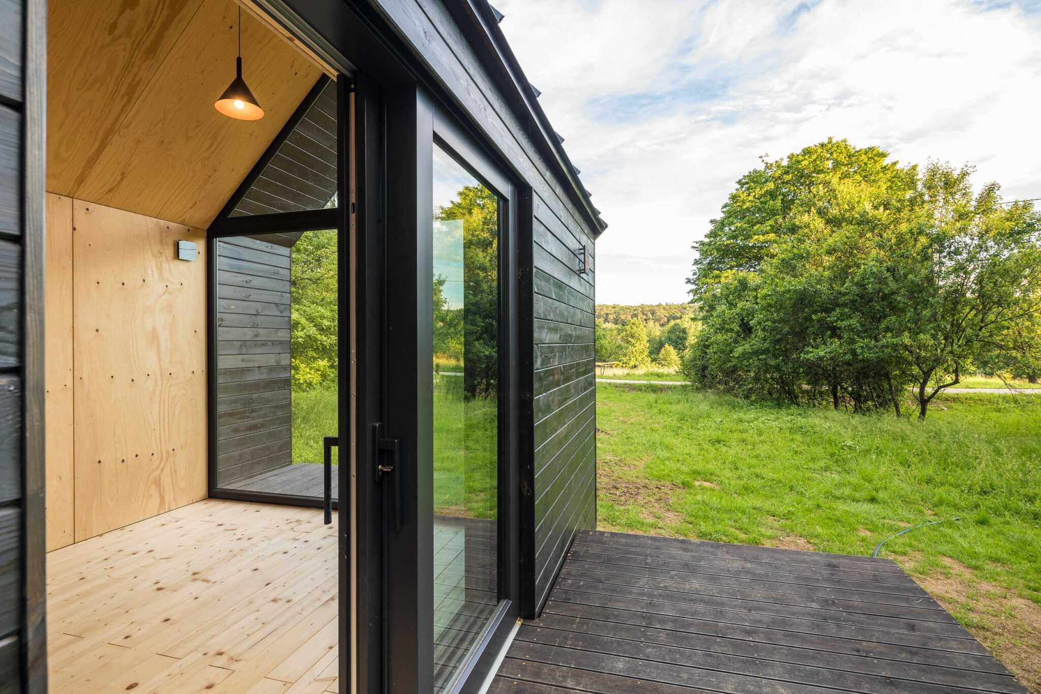 Like the traditional farmhouses of the region, the Kabinka Spa has a longitudinal orientation. On its long side, a glazed entrance and a spacious terrace with a view of the garden and its buildings were placed. To match the adjacent modern barn-style house, the end wall of the cabin is also made of glass so, from the sauna, one can enjoy a great view of the small valley next to the house. The bedroom on the other side of the building is shaded by the trees of the forest belonging to the land. The construction of the Bath House took only a week, as all the elements arrived at the site prefabricated and ready to assemble. Thanks to the shift building process, the cabin – built in May – was available to its owners the whole summer already.