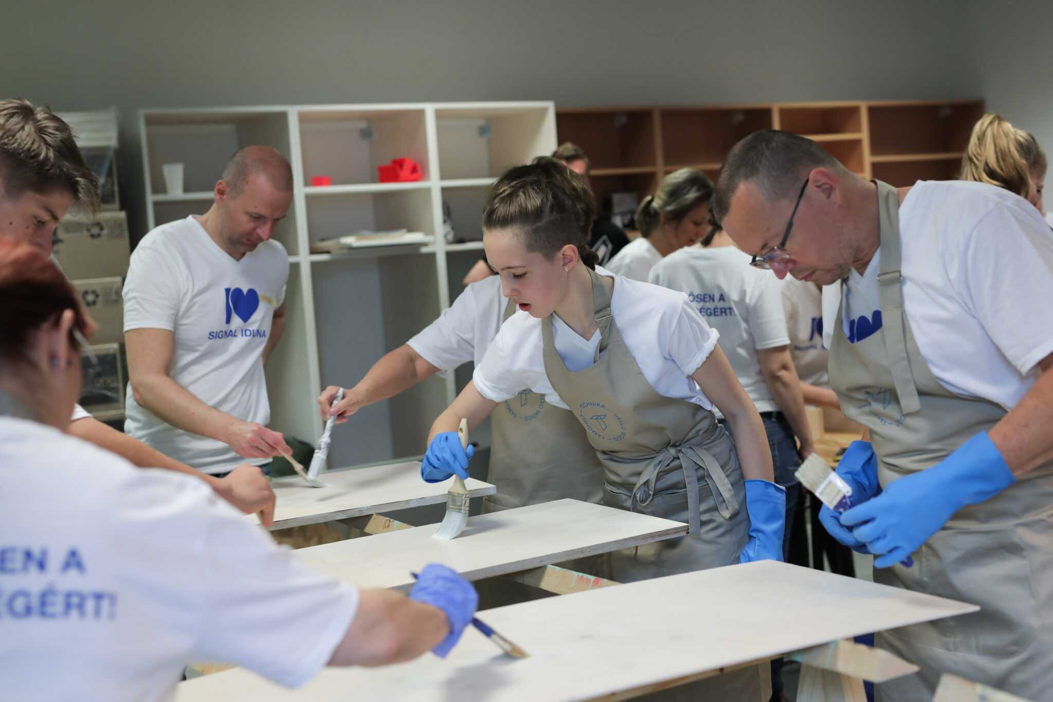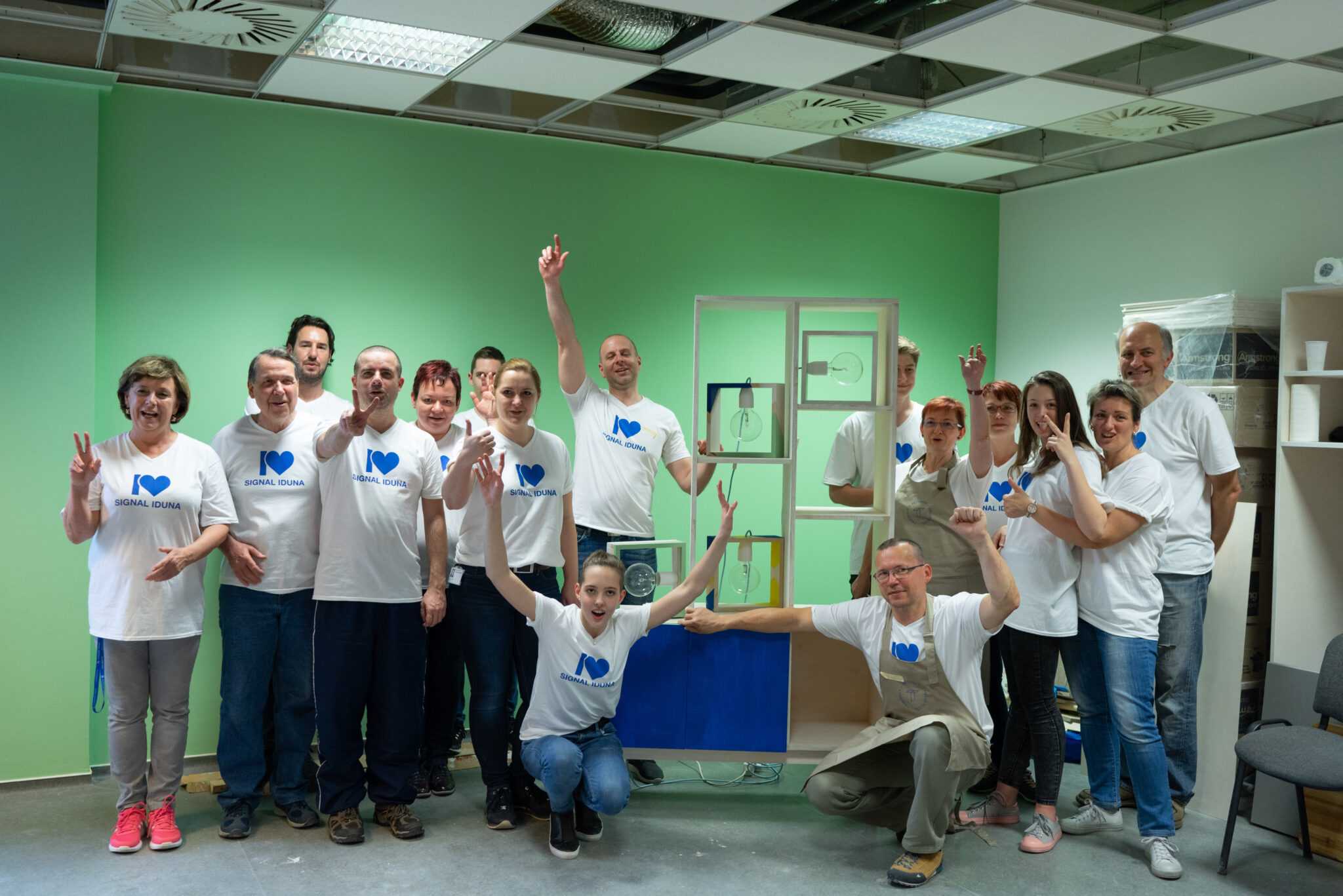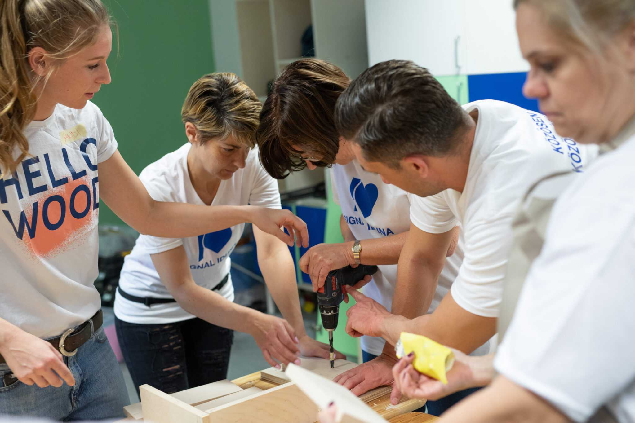 Kitchen redesign with a twist Signal IDuna Biztosító Zrt. asked Hello Wood team to redesign 4 kitchens at their office. After our team reconstructed the spaces, we invited the colleagues of Signal for a team building to add the finishing touches to their new community halls. Design lamps and a cupboard were made and painted by them, making the kitchens feel more like their own. Scroll through the pictures to see the result and the happy moments of this cool team building!