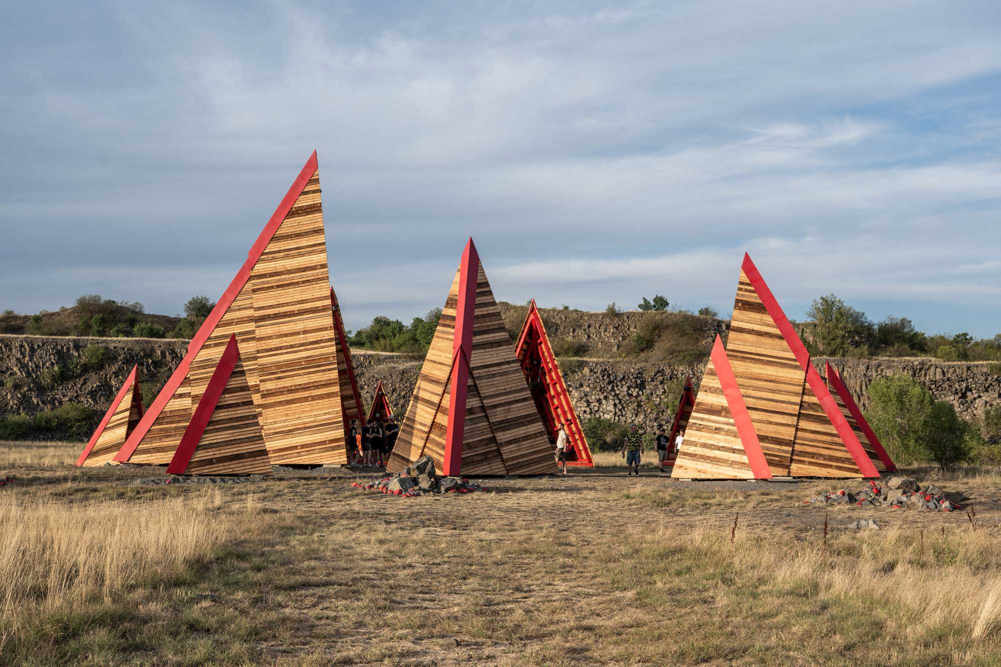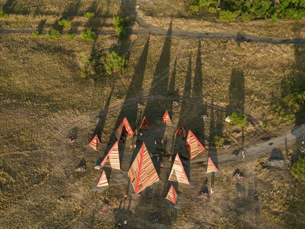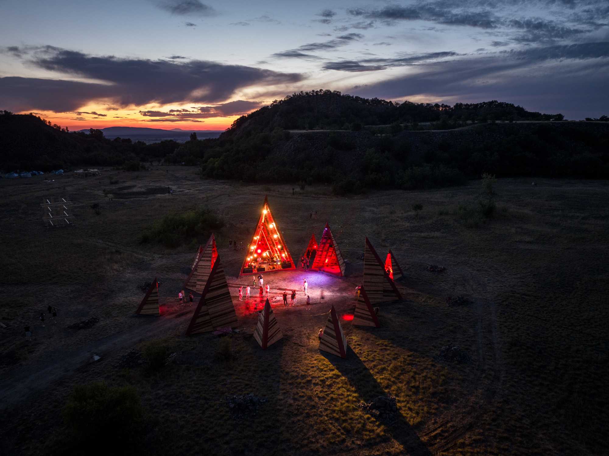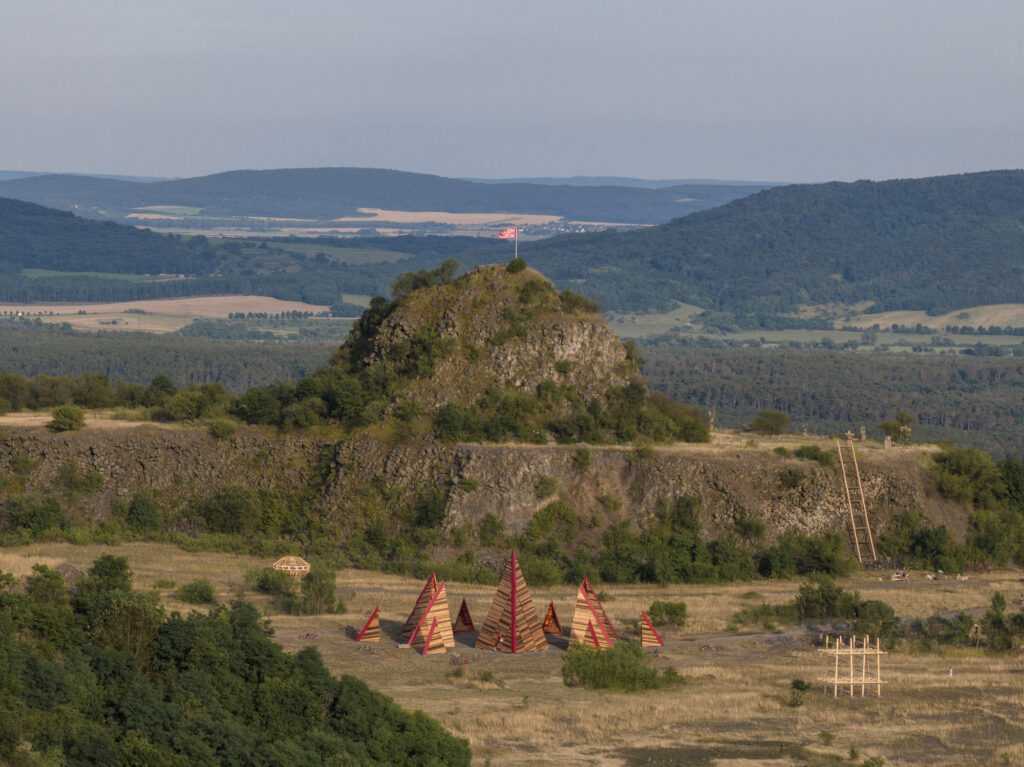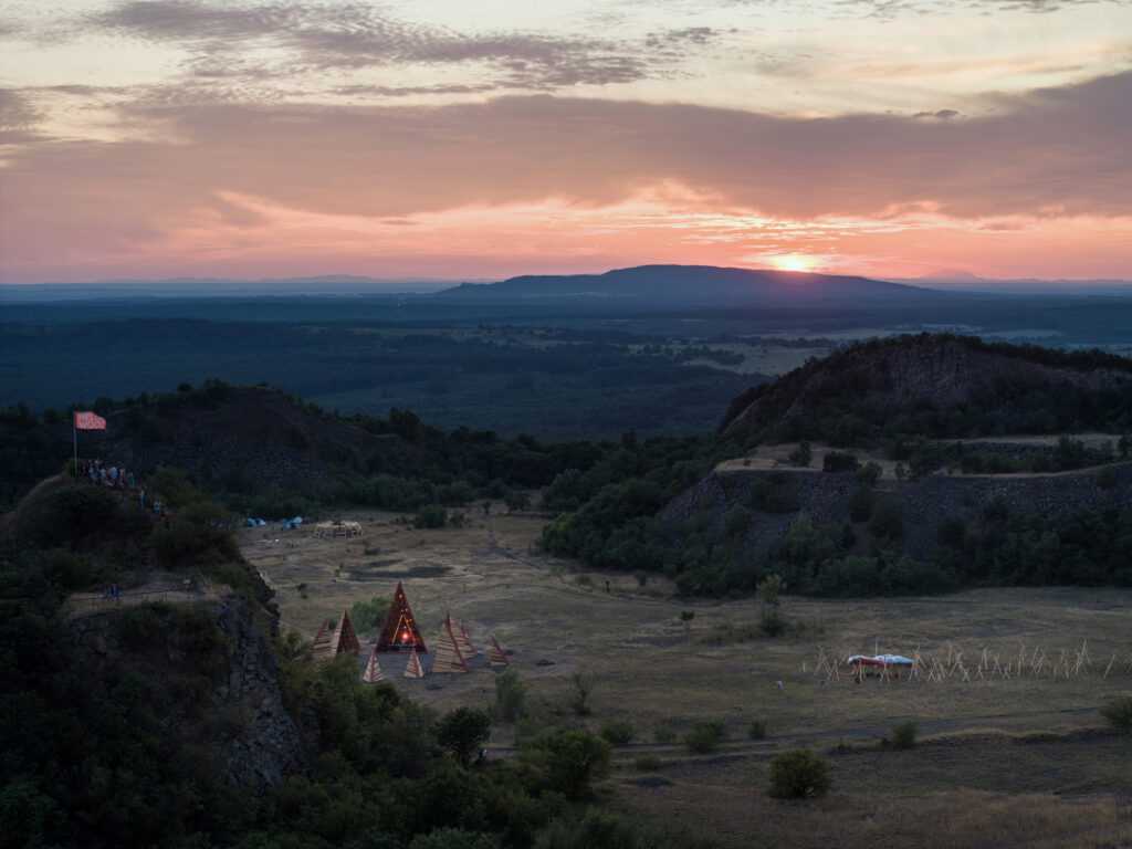 After a three-year break, our summer school & builder festival returned to welcome students, architects, and young professionals from all across the world to join the 10-day builder camp to test their wooden construction abilities, learn to collaborate, and participate actively in on-site design and construction. For the first time in Hello Wood’s 13-year history, this year’s workshop took place at a new location, in the crater of an abandoned basalt quarry on Haláp Mountain in Hungary. Monument of Builders was built to serve as the community’s meeting venue and central installation piece.