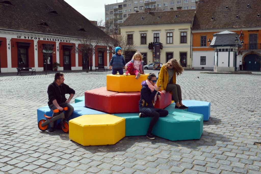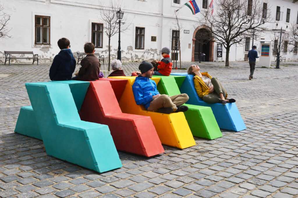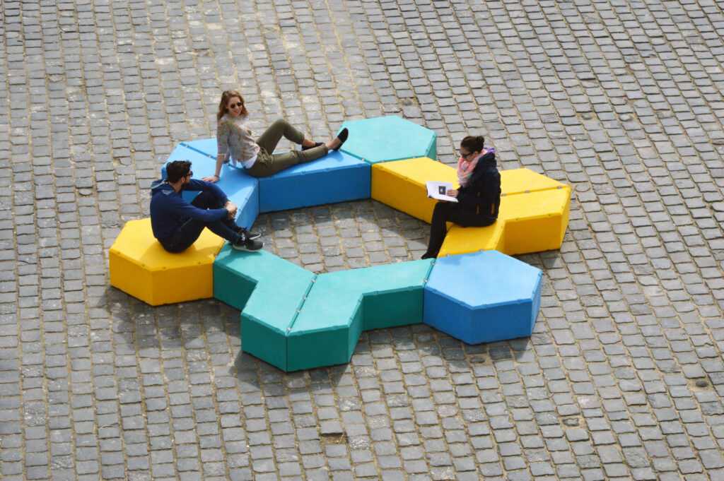 This set of outdoor furniture was inspired by the work of Hungarian artist Victor Vasarely. It consists of hexagonal elements that can be easily rearranged to suit specific needs. The colorful pieces fit together like a puzzle to create a myriad of designs and fulfill different functions.